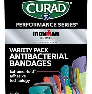 CURAD Performance Series presents IRONMAN Antibacterial Bandages, fortified with cutting-edge Extreme Hold adhesive technology for unwavering support. This assorted variety pack includes Standard, XL, Finger & Knuckle Fabric Bandages, totaling 50 in each pack. Engineered for endurance, these bandages are crafted with durable, heavy-duty fabric, offering outstanding protection suited for active individuals engaged in sports and rigorous activities. Featuring an antibacterial non-stick pad containing 0.8% Benzalkonium Chloride, these bandages help prevent infection while ensuring wound comfort without disruption. The rugged woven fabric is not only tough but also flexible, conforming to the body’s movements for unparalleled comfort. Compared to other leading brands, the Performance Series bandages offer an impressive 3X more absorbency. Designed to endure the toughest workouts and competitions, these bandages stay put through rain, mud, and relentless movement. The CURAD Performance Series IRONMAN Antibacterial Bandages prioritize comfort, dirt protection, and germ resistance, ensuring unwavering support when faced with challenges. *Not for use on delicate and sensitive skin.