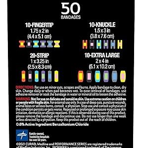 CURAD Performance Series IRONMAN Antibacterial Bandages, Extreme Hold Adhesive Technology, Finger & Knuckle Bandages, Flexible Fabric, Variety Pack with Assorted Sizes & Colors, 50 Count
