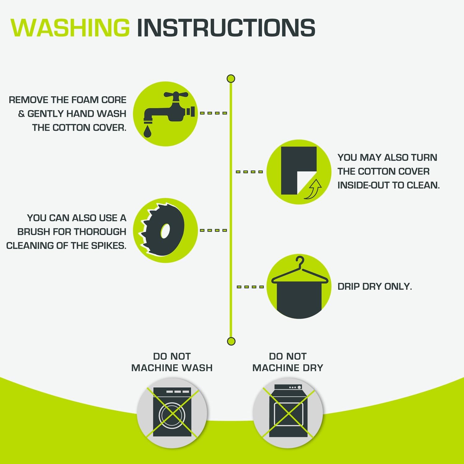 | Product Care Instructions | Store your Acupressure Mat and Pillow in a cool, dry place. To clean, remove the foam core and and gently hand wash the cotton cover. You may also turn the cotton cover inside-out to clean. Do not machine wash or dry, as this may damage the pressure point buttons. Drip dry only. |